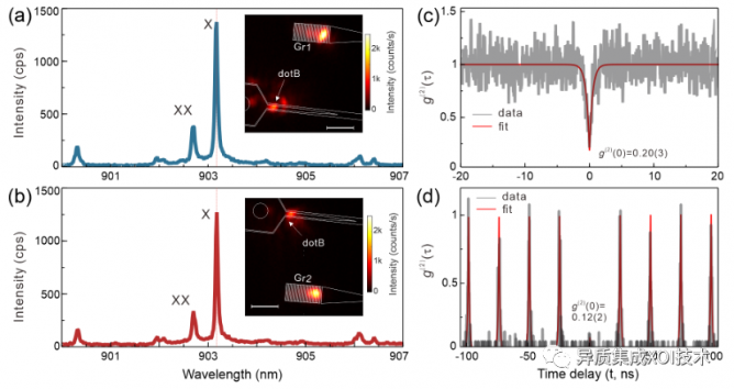 圖2. (a)和(b)是分別從頂部和底部光柵耦合器上采集的量子點光致發(fā)光譜(PL),插圖分別顯示了MMI器件針對量子點激子發(fā)光峰(X)的二維PL掃描圖,其中的標尺長度為8 μm;(c)和(d)為從分離的兩個光柵耦合器中收集的激子光子的歸一化二階空間互相關(guān)函數(shù),分別在連續(xù)波激光激勵條件下(c)和脈沖激光激勵條件下(d)測量。