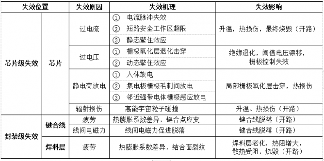 目前研究普遍按失效部位將IGBT模塊失效分為芯片級失效和封裝級失效,詳細(xì)的分類如上圖3所示,對應(yīng)機(jī)理分析綜述于表1。