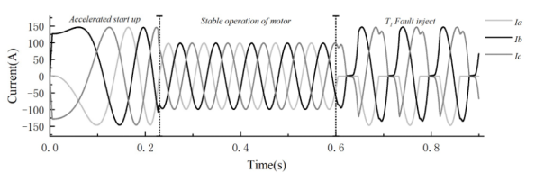 采用電流參數(shù),配合信號處理方法,可對故障特征進(jìn)行提取。當(dāng)IGBT發(fā)生開路故障時(shí),IGBT對應(yīng)相的電流只有半個周期,且其余相的電流存在一定程度的畸變。以兩電平逆變器T1故障為例,當(dāng)T1發(fā)生開路故障前后,其仿真電流波形如下圖4所示。
