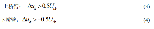 在基于模型方面,文獻(xiàn)[15]提出了一種基于電壓偏差的平均模型診斷方法,該方法通過建立的模型分別得到線電壓和相電壓的估計(jì)值,分別與觀測到的真實(shí)值計(jì)算殘差,進(jìn)而得到故障特征值,可以對單管開路的IGBT和電流傳感器故障進(jìn)行診斷。針對于電壓、電流均可采樣的三相逆變器,文獻(xiàn)[41]提出將逆變器橋臂電壓作為故障特征,利用平均模型法分別得到三線制和四線制的逆變器的診斷變量,結(jié)合誤差自適應(yīng)的閾值方法,得到魯棒性強(qiáng)的單管、雙管故障診斷規(guī)則。文獻(xiàn)[16]通過建立換流器開關(guān)函數(shù)模型,利用三相電壓殘差作為故障特征,實(shí)現(xiàn)了單橋臂IGBT開路和雙橋臂IGBT開路故障的在線診斷,并進(jìn)行了實(shí)驗(yàn)驗(yàn)證了方法的抗干擾性,上下橋臂電壓殘差的閾值如公式3和4所示。