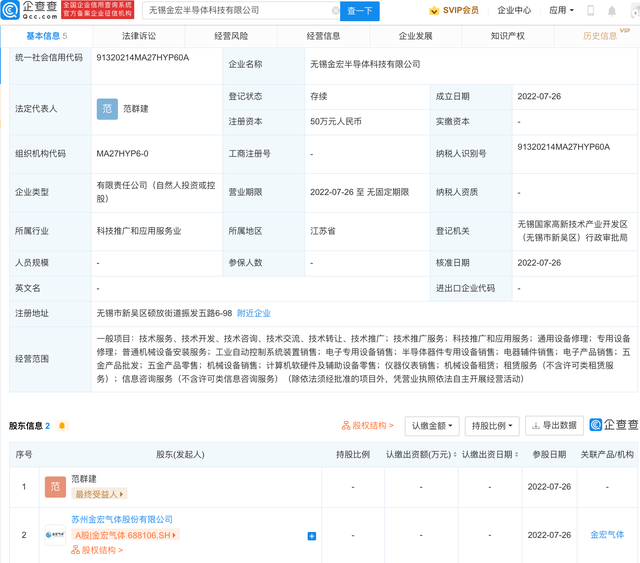 半導(dǎo)體產(chǎn)業(yè)網(wǎng)訊,企查查顯示,7月26日,無錫金宏半導(dǎo)體科技有限公司成立,法定代表人為范群建,注冊資本50萬元,經(jīng)營范圍包含:工業(yè)自動控制系統(tǒng)裝置銷售;電子專用設(shè)備銷售;半導(dǎo)體器件專用設(shè)備銷售;電器輔件銷售等。企查查股權(quán)穿透顯示,該公司由金宏氣體、范群建共同持股。