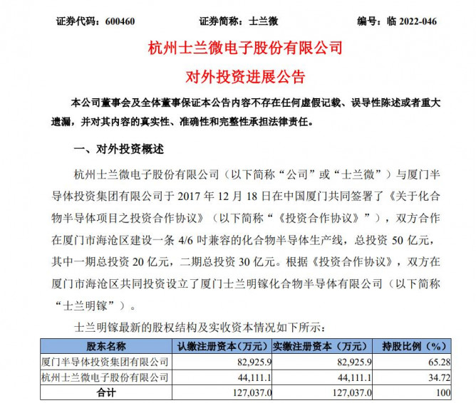 根據(jù)《投資合作協(xié)議》,雙方在廈門(mén)市海滄區(qū)共同投資設(shè)立了廈門(mén)士蘭明鎵化合物半導(dǎo)體有限公司(簡(jiǎn)稱(chēng)“士蘭明鎵”)。