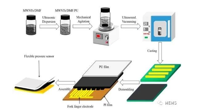 在本論文中,研究人員提出一種簡單易復(fù)制的柔性壓力傳感器制造方法。首先,采用機械有限元法(FEM)研究了微觀結(jié)構(gòu)尺寸參數(shù)對傳感器性能的影響,并對相關(guān)參數(shù)進行了優(yōu)化。接著,使用印刷電路板(PCB)基材模壓多壁碳納米管/聚氨酯(MWCNT/PU)導(dǎo)電復(fù)合材料制備出活性層。最后,通過將活性層和叉指電極相結(jié)合制備出MCNF柔性壓力傳感器。