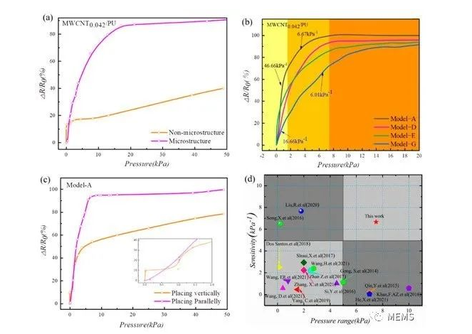 MCNF柔性壓力傳感器的傳感性能。(a)有無微結(jié)構(gòu)傳感器的壓力響應(yīng)。(b)相同MWCNT含量、不同微結(jié)構(gòu)MCNF傳感器的壓力響應(yīng)。(c)垂直平行放置于電極的MCNF傳感器的壓力響應(yīng)。(d)對比文獻研究與本研究傳感器的敏感度和工作范圍。