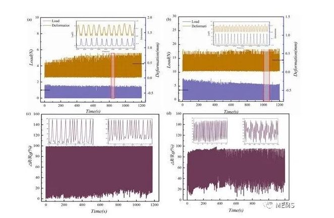 MCNF柔性壓力傳感器的循環(huán)加載實驗結(jié)果:模型−A循環(huán)加載(a)0–1 N和(b)0-5 N;(c)模型−A和(d)模型-E在0–10 kPa循環(huán)載荷下的壓阻響應(yīng)曲線。