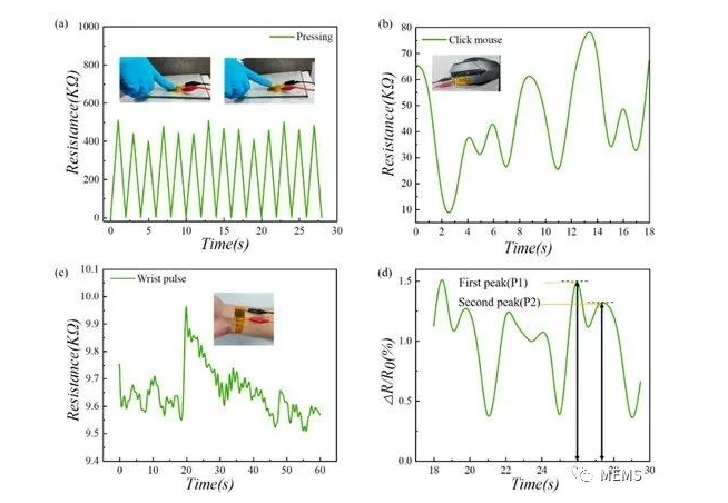 MCNF柔性壓力傳感器在實時監(jiān)測人體活動中的應(yīng)用:(a)手指按壓;(b)鼠標點擊;(c)實時脈搏檢測;(d)脈搏振動波形。