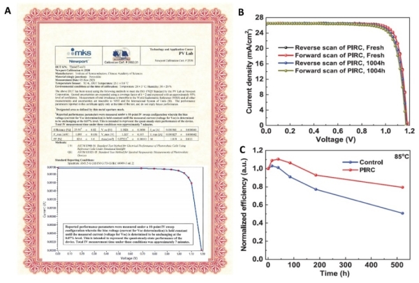 圖2.A、第三方權(quán)威機(jī)構(gòu)美國(guó)Newport認(rèn)證書,認(rèn)證效率為25.6%,插圖為認(rèn)證效率曲線;B、有無穩(wěn)定二次相PIRC器件放置的電流-電壓曲線;C、有無穩(wěn)定二次相PIRC器件在85oC加速老化下的穩(wěn)定性。