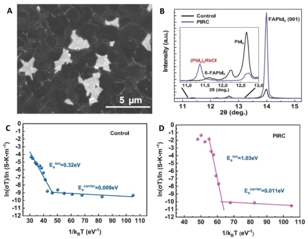 圖1.A、具有PIRC二次相鈣鈦礦的掃描電子顯微鏡照片;B、有無PIRC的鈣鈦礦薄膜X射線衍射圖譜(插圖為局部放大圖);C與D分別為有無PIRC的鈣鈦礦電導(dǎo)與溫度關(guān)系圖。