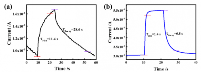圖2 CdSe量子點修飾ZnO微米線前后探測器的響應(yīng)時間。(a)ZnO微米線光電探測的響應(yīng)時間;(b)CdSe量子點修飾ZnO微米線光電探測器的響應(yīng)時間