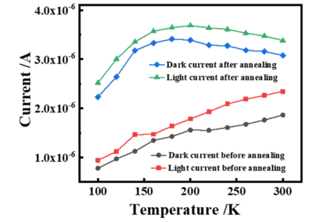 為了研究退火對CdSe量子點修飾的ZnO微米線探測器光電性能的影響,將CdSe量子點修飾的ZnO微米線在Ar氣氛下600 ℃退火30 min。圖3為退火前后CdSe量子點修飾ZnO微米線光電探測器的光暗電流隨溫度變化的曲線圖。
