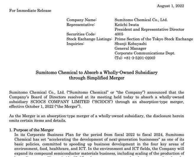 為了擴大化合物半導(dǎo)體材料業(yè)務(wù),住友化學(xué)8月1日宣布與全資子公司Sciox合并,并將于今年10月1日起生效,將其并入公司的IT相關(guān)化學(xué)品部門。Sciox是全球市占率領(lǐng)先的GaN(氮化鎵)單晶襯底廠商,2015年住友化學(xué)在收購日立金屬的半導(dǎo)體材料業(yè)務(wù)后成立了Sciox。