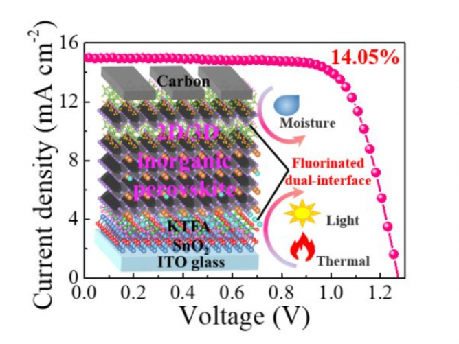 在題為“Fluorinated Interfaces for Efficient and Stable Low-Temperature Carbon-based CsPbI2Br Perovskite Solar Cells”的論文中,該課題組提出了一種氟化雙界面策略,以克服低溫碳基無機(jī)鈣鈦礦太陽能電池中普遍存在的體相缺陷和界面能級失配損害器件光伏性能的難題。即在無機(jī)CsPbI2Br鈣鈦礦吸光層的上下界面引入三氟乙酸鉀和4-三氟苯甲基溴化銨。得益于鈍化的薄膜缺陷,合適的能級匹配,促進(jìn)的電荷提取,以及抑制的電荷非輻射復(fù)合和離子遷移,雙界面優(yōu)化的器件實(shí)現(xiàn)了14.05%的效率,且表現(xiàn)出更好的濕、熱和光照穩(wěn)定性。論文第一署名單位是武漢大學(xué)工業(yè)科學(xué)研究院,2020級博士生張祥為第一作者,臺啟東研究員為唯一通訊作者。