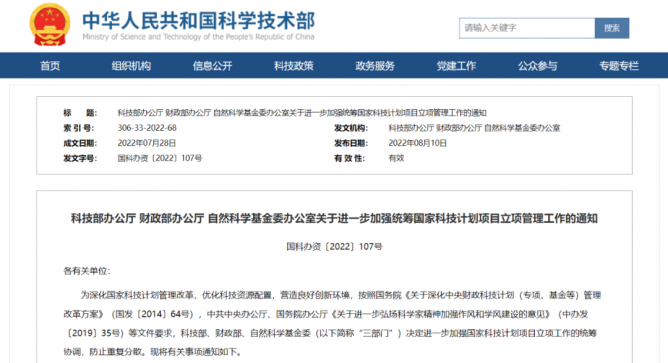 10日,科技部網(wǎng)站公布《關(guān)于進(jìn)一步加強(qiáng)統(tǒng)籌國(guó)家科技計(jì)劃項(xiàng)目立項(xiàng)管理工作的通知》(以下簡(jiǎn)稱《通知》),其中提到,進(jìn)一步強(qiáng)化各類國(guó)家科技計(jì)劃組織實(shí)施的銜接協(xié)同,優(yōu)化科技資源配置,避免重復(fù)申報(bào)和重復(fù)資助,增強(qiáng)創(chuàng)新鏈整體效能,全面支撐科技自立自強(qiáng),推動(dòng)引領(lǐng)經(jīng)濟(jì)社會(huì)高質(zhì)量發(fā)展。