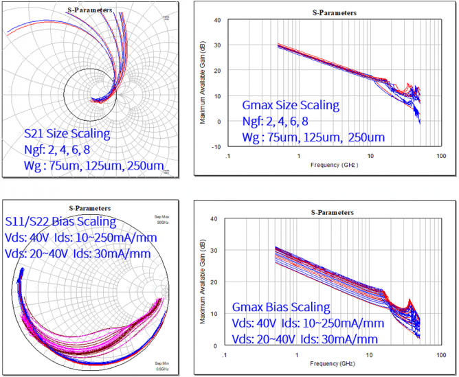 小信號和大信號行為建模的準(zhǔn)確性至關(guān)重要。小信號建模對于設(shè)計者預(yù)測功率放大器設(shè)計方案的增益、回波損耗和穩(wěn)定性很關(guān)鍵。Wolfspeed 模型根據(jù)不同柵寬、指尖數(shù)和偏壓范圍上的測量數(shù)據(jù)進(jìn)行評估,以確保所有三個關(guān)鍵領(lǐng)域的模型精度:DC-IV、小信號和大信號行為。