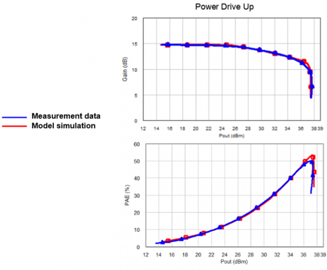 圖 3 中的曲線圖顯示,建模的增益和 PA 效率都和測量數(shù)據(jù)非常吻合,遠(yuǎn)超 1 dB 和 3 dB 壓縮點。這對于 GaN 器件至關(guān)重要,因為與等效 LDMOS 器件不同,GaN HEMT 往往會產(chǎn)生超過 3 dB 壓縮點的最大額定功率輸出。