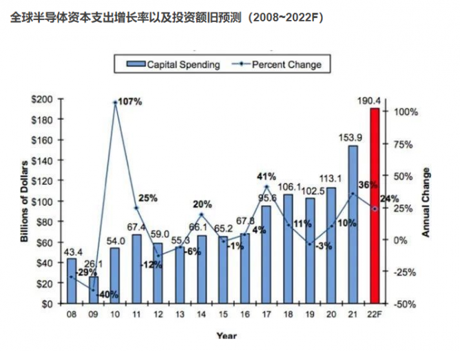 近日,半導(dǎo)體研究機(jī)構(gòu)IC Insights在最新報(bào)告中調(diào)整了對(duì)2022年全球半導(dǎo)體資本支出的預(yù)測(cè)。今年年初,IC Insights預(yù)測(cè)2022年全球半導(dǎo)體資本支出為1904億美元,同比增長(zhǎng)24%;調(diào)整后的新預(yù)測(cè)為1855億美元,增長(zhǎng)率為21% 。盡管有所下調(diào),但資本支出仍是新高。