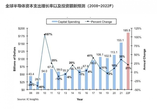 不過(guò)這一數(shù)字與此前的預(yù)測(cè)相比有所減少。今年年初的時(shí)候,IC insights調(diào)研了全球13家企業(yè),并且預(yù)測(cè)這些公司今年的資本支出將增加超過(guò)40%。這13家公司去年總支出比2020年增長(zhǎng)62%至606億美元,預(yù)計(jì)今年支出將同比增長(zhǎng)52%至918億美元。