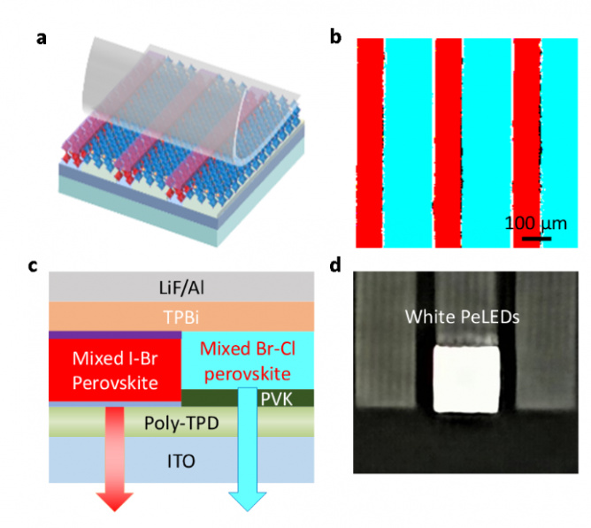 基于此,肖正國教授課題組使用表面能很低的聚二甲基硅氧烷PDMS襯底進(jìn)行鈣鈦礦薄膜和微納結(jié)構(gòu)的巨量轉(zhuǎn)移。在不改變鈣鈦礦薄膜的表面形貌、成分和光電性能的前提下,成功將鈣鈦礦薄膜轉(zhuǎn)移到柔性襯底上。在器件制備過程中,使用一層超薄的支化聚乙烯亞胺作為鈣鈦礦與傳輸層之間的化學(xué)結(jié)合層,能大大增強(qiáng)轉(zhuǎn)移器件界面處的電接觸。膜轉(zhuǎn)移方法制備的鈣鈦礦發(fā)光二極管具有與優(yōu)化的旋涂器件相同的外量子效率。另外,使用該方法還能夠制備分高辨率、大面積鈣鈦礦微納結(jié)構(gòu)。在此基礎(chǔ)上,通過將紅光鈣鈦礦條紋與天藍(lán)光鈣鈦礦條紋交替排列,成功制備出了白光鈣鈦礦發(fā)光二極管 。