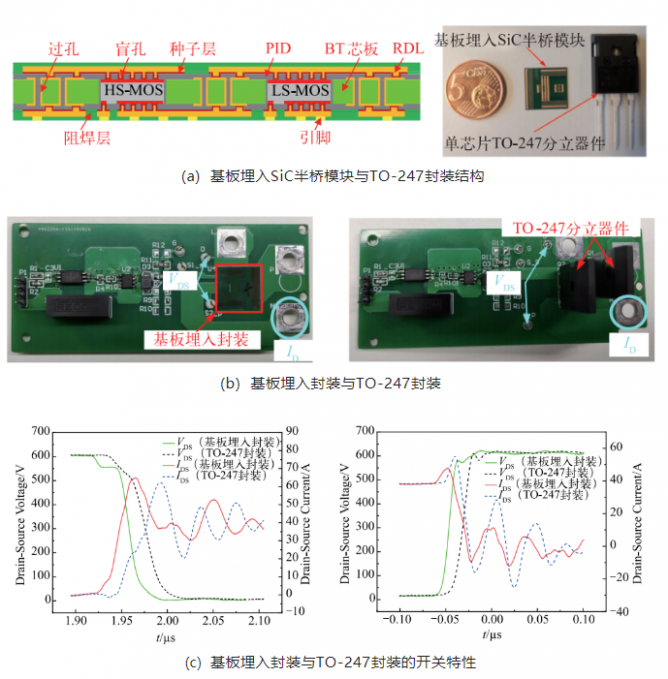 圖1 基于基板埋入技術的SiC半橋模塊封裝與單芯片TO-247封裝的開關特性對比分析
