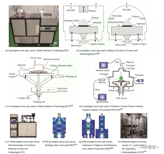 隨著 5G 時代的興起,由于材料特性所限,第 1代(Si 等)、第 2 代(GaAs 等)半導(dǎo)體材料器件性能無法滿足輸出功率等的要求,以 GaN、SiC 為代表的第 3 代半導(dǎo)體的研究又被推到了新的高度。以通訊及國防領(lǐng)域有著重要應(yīng)用的 GaN 射頻器件為例,其市場從 2018 年的 6.45 億美元將增長至 2024 年約 20億美元。但隨著功率密度的提升,隨之而來的熱效應(yīng)劇烈增加,已經(jīng)成為制約 GaN 基半導(dǎo)體器件發(fā)展最重要的瓶頸,經(jīng)過近年來的發(fā)展,熱流密度已至數(shù)百 W/cm2 ,而若要達(dá)到器件理論極限,熱流密度將再度提高 1 個數(shù)量級,器件熱點處熱流密度幾近太陽表面熱流密度,這也對散熱材料提出了新的需求:器件熱量密度不均勻,需要更高的導(dǎo)熱性能進行均溫;熱量密度提升,需要更優(yōu)的主動散熱方式帶走熱量。傳統(tǒng)散熱材料以金屬及合金、陶瓷材料等為主,金屬材料有著較高的熱導(dǎo)率,但在封裝過程中存在導(dǎo)電的風(fēng)險;而陶瓷材料絕緣性好,強度高,但熱導(dǎo)率較差,隨著裝備小型化、輕量化的要求,以熱導(dǎo)率/密度(λ/ρ)的比值成為評判材料散熱性能的新參數(shù)。以 Kovar、Invar、氧化鋁為代表的材料低于 10 W?cm 3 /(m?K?g),一般作為密封及結(jié)構(gòu)材料,熱性能較差;傳統(tǒng)散熱材料其 λ/ρ 所處區(qū)間一般為10~100 W?cm 3 /(m?K?g),如金屬銅、銀、部分合金及SiC 等,但隨著半導(dǎo)體器件的跨代發(fā)展,對散熱材料的需求也急劇提升,λ/ρ 達(dá)到銅 10 倍以上的金剛石材料逐漸嶄露頭角,有著輕質(zhì)高強、超高熱導(dǎo)率、絕緣性好等其他材料難以企及的優(yōu)勢,受到了學(xué)術(shù)界和產(chǎn)業(yè)界的廣泛關(guān)注。目前,人造金剛石主要存在高溫高壓法(HPHT法)及化學(xué)氣相沉積法(CVD 法) 2 種制備方法,HPHT 法主要用于單晶塊體顆粒金剛石的制備,由于制備過程采用金屬催化劑且含較多氮雜質(zhì),傳統(tǒng)HPHT 法制備金剛石多成黃色小顆粒狀,隨著產(chǎn)量及制造水平的提升,部分無色寶石級 HPHT 金剛石已進入市場,但顆粒尺寸仍較小,無法滿足各形態(tài)的散熱需求。而 CVD 法中的微波等離子體化學(xué)氣相沉積法(MPCVD 法)制備的金剛石具有生長工藝穩(wěn)定,純度高,可大面積制備易成膜,熱導(dǎo)率高等優(yōu)點,因此被廣泛用作雷達(dá)組件等超高熱流密度條件下的散熱材料。然而我國雖然人造金剛石總產(chǎn)量達(dá)全球 95%以上,但主要為 HPHT 金剛石,由于“Wassenaar 協(xié)定”的限制,“發(fā)展和生產(chǎn)電子器件用金剛石襯底或薄膜技術(shù)”被以美國為首的多國禁運。因此,發(fā)展自主知識產(chǎn)權(quán)的 MPCVD 設(shè)備是金剛石散熱產(chǎn)業(yè)化的關(guān)鍵。基于此,本文主要以 MPCVD 設(shè)備為基礎(chǔ),通過金剛石不同晶態(tài)延伸出不同的散熱應(yīng)用場景,介紹了近年來一些典型的金剛石散熱應(yīng)用最新研究進展,并闡述和概括各項技術(shù)路線的技術(shù)問題和發(fā)展方向。