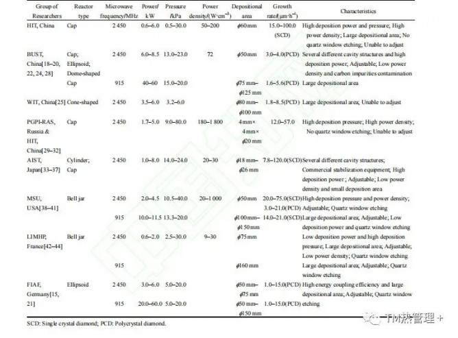 為進一步提高金剛石品質(zhì)和生長速率,又發(fā)展出了多種形式的 MPCVD 金剛石生長系統(tǒng),根據(jù)沉積腔體的結(jié)構(gòu)可分為:石英鐘罩式、圓柱金屬諧振腔式、環(huán)形天線(CAP)式、橢球諧振腔式以及一些其他類似的結(jié)構(gòu)形式,其中,圓柱金屬諧振腔式 MPCVD 沉積腔體為帶水冷的不銹鋼夾層,與石英鐘罩式 MPCVD 系統(tǒng)相比,允許更高的微波功率輸入,但 2 者均存在等離子體刻蝕石英,導(dǎo)致金剛石膜中存在 Si 雜質(zhì)污染的問題。CAP 式諧振腔的微波輸入窗口設(shè)置在樣品臺下方,遠(yuǎn)離等離子體放電區(qū)域,減少了等離子體對石英窗的刻蝕,提高了系統(tǒng)高功率下運行的穩(wěn)定性。橢球形諧振腔利用橢球 2 個焦點對微波電場的聚集效應(yīng),使得等離子體位置不依賴于微波輸入功率和氣體壓力,能夠在沉積臺上方穩(wěn)定激發(fā),該系統(tǒng)實現(xiàn)了 6 kW、14 kPa、直徑 5.0~7.5 cm的沉積面積,但石英鐘罩的存在同樣會導(dǎo)致等離子體刻蝕石英污染金剛石。經(jīng)過幾十年的發(fā)展,目前幾種 MPCVD 金剛石生長系統(tǒng)已經(jīng)能夠在0.5~8.5 kW、0.5~40.0 kPa 條件下運行,功率密度和沉積面積也逐步提升,部分研究組研究設(shè)備及性能如表 1 所示。