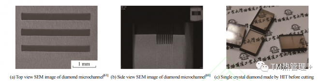 中國研究主要類似于 Müller 等采用的金屬掩膜過渡生長的方法,在金剛石表面利用金屬制備掩膜版,金剛石生長過程中會產(chǎn)生橫向外延過程(ELO)覆蓋金屬掩膜,從而形成金剛石槽道。Fu 等采用金屬鎢和 ELO 過程制備微流道并通水實驗,微流道截面尺寸 10 μm×1 μm,但由于 ELO 生長表面閉合過程,微流道截面呈 T 字形,影響其流動特性。次年,結(jié)合電感耦合等離子體(ICP)方法,增加了金剛石微流道深度,可達(dá) 20 μm 以上,為金剛石微通道的應(yīng)用更進一步。崔健磊教授團隊,采用納秒、飛秒激光對多晶金剛石的加工進行了深入研究,系統(tǒng)研究了激光能量、掃描速率、掃描次數(shù)、焦點位置等參量及其優(yōu)化工藝參數(shù)對金剛石微槽尺寸的影響規(guī)律,對激光燒蝕閾值進行了預(yù)測及實驗,加工出側(cè)壁錐度 3°內(nèi)的高質(zhì)量金剛石微流道。為進一步提升散熱性能,將其激光加工方式推廣至單晶金剛石,與哈爾濱工業(yè)大學(xué)及中國電科 38 所合作,開發(fā)應(yīng)用于雷達(dá)功率組件的單晶金剛石微流道散散熱器,熱流密度可達(dá)1.38 kW/cm2,遠(yuǎn)遠(yuǎn)優(yōu)于傳統(tǒng)多晶金剛石微流道散熱達(dá)到的 267 W/cm2及 473.9~1 000.4W/cm2。這對中國雷達(dá)組件、高能數(shù)據(jù)中心等超高熱流密度應(yīng)用場景發(fā)展有著極大推進作用。