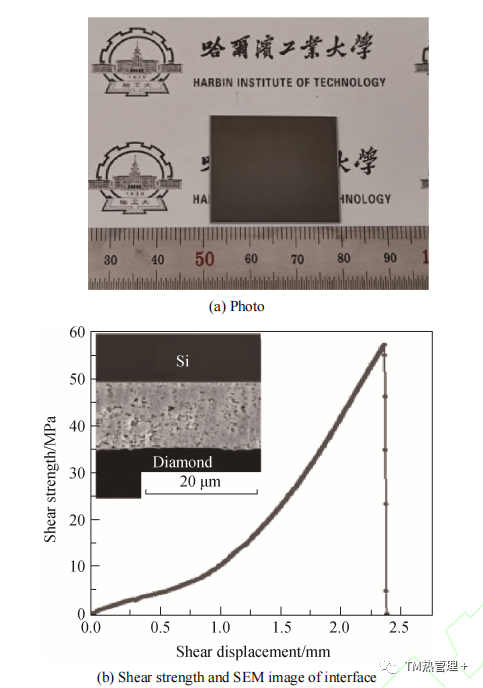 然而,在實際操作中,功率器件通常會通過器件模塊中的焊錫鍵合直接安裝到金剛石散熱器上。焊錫鍵合廣泛用于器件集成,因為它不需要非常低的材料表面粗糙度,并且還可以在相對較低的溫度下實現(xiàn)鍵合。但是,用于焊料鍵合的 AgSn [33 W/(m·K)]和AuSn [57 W/(m·K)]的熱導(dǎo)率比金剛石低2個數(shù)量級,厚度為焊料層通常大于 100 μm,會引入高界面熱阻,因此這種方法通常被認(rèn)為不適合與金剛石集成的功率器件。由于納米/微米銀粒子具有燒結(jié)溫度低(< 300 ℃)、燒結(jié)后熔點高(960 ℃)、導(dǎo)熱系數(shù)高[>200 W/(m·K)]等諸多潛在優(yōu)勢。因此,它在電子封裝領(lǐng)域得到了廣泛的應(yīng)用,例如芯片互連以及芯片與金屬或陶瓷基板的連接。然而,對于金剛石,大多數(shù)金屬或合金難以有效潤濕其表面,且漿料在燒結(jié)過程中有機物揮發(fā)和界面中的黏合劑分子難以燒盡,多數(shù)情況下燒結(jié)銀粘貼僅適用于 10mm×10mm 或更小尺寸的接口連接。基于該技術(shù)結(jié)合酸洗–等離子體雙步法對金剛石表面活化處理,增強界面連接,有效降低連接熱阻,在 220℃燒結(jié)實現(xiàn)了大面積金剛石散熱器和 Si 芯片(27 mm×28 mm)的低宏觀界面熱阻(TIR)和高強度結(jié)合。Si–金剛石鍵合系統(tǒng)的 TIR 可小于 500m2 ·K/GW,同時剪切強度大于 50MPa。它表明在各種電子組件中的互連以及在激光設(shè)備中產(chǎn)生尺寸穩(wěn)健的接合或高功率設(shè)備的熱管理方面具有廣闊的應(yīng)用前景。
