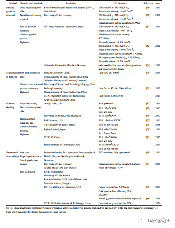 納米金剛石膜材料用作散熱一般為高熱流密度器件鈍化層,傳統(tǒng)器件一般采用氮化硅為鈍化層,防止外界環(huán)境波動對功能層的影響,但熱導(dǎo)率極低,若采用金剛石材料替換傳統(tǒng)鈍化層,可在器件表面進行均熱,為器件增加一條導(dǎo)熱通路,提升器件表面均溫性能。但氫等離子體對氮化鎵具有反應(yīng)刻蝕作用,導(dǎo)致器件直接沉積金剛石的方法需要低溫條件并且需要耐氫設(shè)計。在耐氫保護層表面,金剛石需要均勻高密度形核,同時需要高定向排列,以提升金剛石鈍化層整體導(dǎo)熱能力。由于氮化鎵器件表面不平整,大面積鈍化層沉積過程中由于非平整表面帶來的應(yīng)力和不連續(xù)性會影響到整個器件的可靠性,這些都為金剛石鈍化層制備帶來較大的困難。Seelmann-Eggebert 等對 GaN 場效應(yīng)晶體管(FETs)表面制備納米金剛石鈍化層展開探索,從保護層、形核、沉積工藝等多方面入手,完成了在GaN-FETs 表面 440 ℃條件下 0.7 μm 及 480 ℃ 2 μm納米金剛石沉積,但是器件性能提升并不明顯。這是由于在低溫條件下,氫等離子體刻蝕作用較差且二次形核過程顯著,晶界處 sp 2 過多,金剛石質(zhì)量較差導(dǎo)致熱導(dǎo)率降低,但仍是首次將金剛石應(yīng)用在GaN 器件表面進行散熱,開創(chuàng)了先河。Alomari 等經(jīng)過 54 h 在 GaN 表面制備出 6.2 μm 的金剛石薄膜,利用 SiO2 及 Si 過渡層,提升了金剛石的生長溫度及金剛石質(zhì)量,首次進行了器件性能測試。美國海軍實驗室(NRL)對納米金剛石增強 GaN 基 HEMT 器件大信號功率特性的影響進行了研究,在 4 GHz 時,輸出功率密度為 5.8 W/mm,增益 10 dB,功率附加效率達(dá) 32.6%,表明了納米金剛石對于 GaN 器件的熱管理有較大應(yīng)用潛力。NRL 又采用氧等離子體刻蝕金剛石膜層進行器件加工,未對器件性能產(chǎn)生損傷,對納米金剛石鈍化層與傳統(tǒng) SiN 鈍化層器件進行對比,得出金剛石結(jié)構(gòu)要遠(yuǎn)優(yōu)于傳統(tǒng)結(jié)構(gòu)的結(jié)論。哈爾濱工業(yè)大學(xué)與中國電科 55 所合作,研制納米金剛石鈍化 GaN 器件,探究了不同過渡層電位的異種電位形核方法,提升了初期形核密度,調(diào)整納米金剛石生長過程參數(shù),采用紅外無接觸循環(huán)退火方法大幅降低金剛石與氮化鎵等異質(zhì)材料的界面應(yīng)力,在 600 ℃制備晶粒尺寸可控納米金剛石鈍化層,實現(xiàn)高導(dǎo)熱金剛石層對器件表面的全覆蓋,GaN HEMTs 器件電流密度提升 20%。此種方法基底尺寸靈活性高,可制備晶圓級大尺寸晶片,原有產(chǎn)線工藝調(diào)整較小,在產(chǎn)業(yè)化方向有著較大優(yōu)勢,是目前較為有潛力的方法。但仍存在納米金剛石熱導(dǎo)率相比單晶熱導(dǎo)率較差,散熱效果有限的問題,仍有進一步探索的空間。表 2 總結(jié)了本文所述部分金剛石器件散熱方法優(yōu)劣及性能參數(shù)。