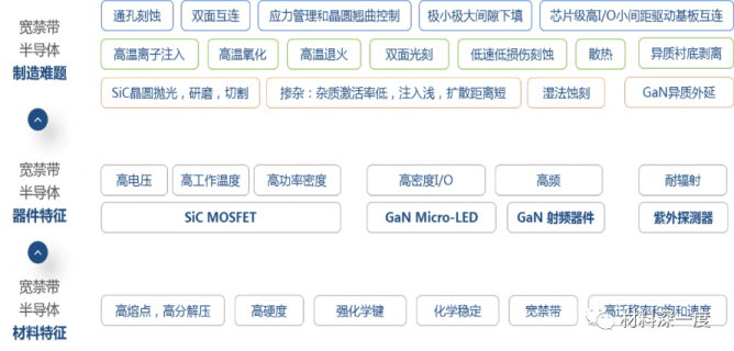 第三代半導(dǎo)體材料具有和傳統(tǒng)半導(dǎo)體硅不同的材料性質(zhì),具有“五高”特征:高電壓,高工作溫度,高頻,高功率密度和高效率,導(dǎo)致其器件制造工藝和技術(shù)上差別很大。從某種程度上看,第三代半導(dǎo)體器件制造具有“極端制造”特點(diǎn)。