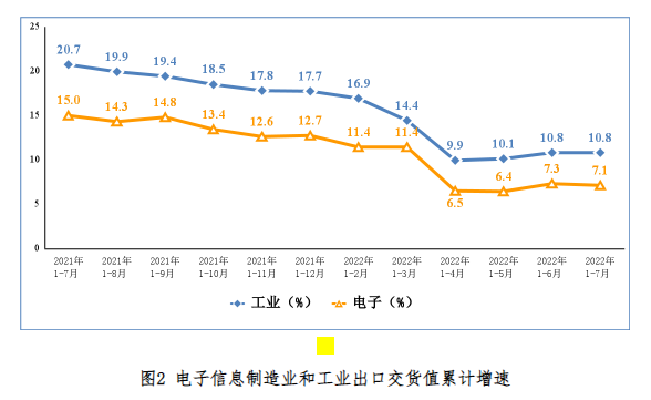 出口方面,1—7月份,規(guī)模以上電子信息制造業(yè)出口交貨值同比增長7.1%,增速較上半年回落0.2個(gè)百分點(diǎn)。其中,7月份,規(guī)模以上電子信息制造業(yè)出口交貨值同比增長3.6%。