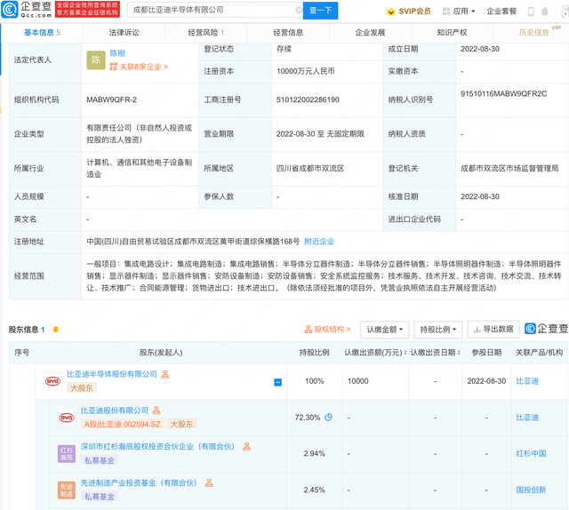 核心提示:企查查APP顯示,近日,成都比亞迪半導(dǎo)體有限公司成立,法定代表人為陳剛,注冊資本1億元人民幣,經(jīng)營范圍包含:集成電路設(shè)計;集