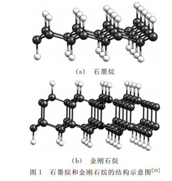 2007年,Sofo等首先在理論上預測了兩側氫化的石墨烯結構石墨烷(Graphane)[24]是一種表面氫化的(111)金剛石單層膜,如圖1(a)所示。2009年,Elias等在實驗上使用石墨烯和氫原子發(fā)生反應合成了石墨烷[25]。2009年,Chernozatonskii等通過雙層石墨烯加氫,形成了氫化二維(111)金剛石膜結構,如圖1(b),可稱為“金剛石烷(diamane)”[26]。該結構是由氫原子吸附在雙層石墨烯的外側形成C-H鍵,兩層之間的碳原子保持了sp3共價鍵。少層石墨烯能夠發(fā)生相變形成二維金剛石,但是表面氫化是穩(wěn)定金剛石相的必要條件。2014年,Kvashnin等提出了“化學誘導相變”或“化學預壓”的概念,預測了少層石墨烯和二維金剛石轉變的相圖,發(fā)現(xiàn)形成表面碳-氫鍵能夠降低相變壓力,使石墨烯轉變?yōu)槎S金剛石薄膜(圖2),為實驗上制備二維金剛石膜提供了新的思路[9]。