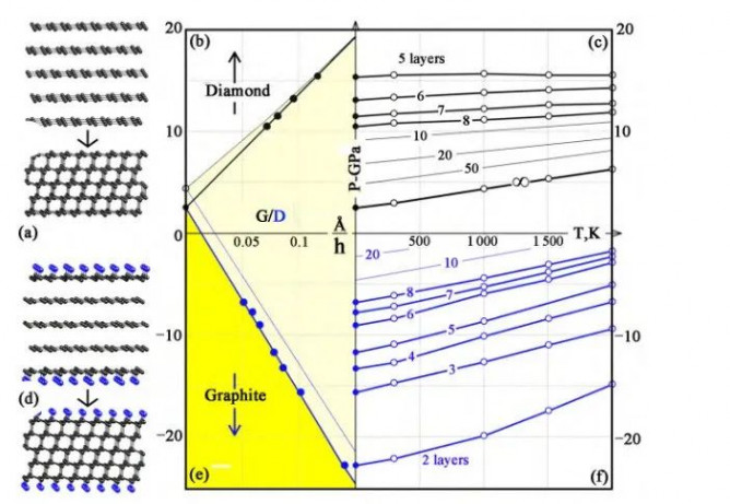 圖2 石墨烯與二維金剛石互相轉變的相圖。(a)5層 石 墨烯結構和相應二維 金 剛 石;(b)相 變 壓 力 與 二 維 納 米膜厚度的函數(shù)關系;(c)層 數(shù) 為n 的 石 墨 烯 和 二 維金剛石相圖P(T);(d)5層 石 墨 烯 和 二 維 金 剛 石結構;(e)相變壓力P 對膜厚度的依賴性;(f)對于不同的層數(shù)從多層石墨烯過渡到金剛石膜的相圖P(T)[9]