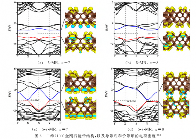 相對于2D(111)金剛石,二維(100)金剛石顯示出相近的依賴于層數(shù)和表面功能化的結構和電學性能[15,22,34]。從金剛石體材料切割的寡層(100)納米薄膜的最外層碳原子具有兩個懸鍵,其聲子色散曲線出現(xiàn)較大的虛頻,表明了其動力學不穩(wěn)定,進行分子動力學模擬,上下兩個表面都重構形成了碳二聚體構型,說明未功能化的二維(100)金剛石表面可重構為穩(wěn)定的二聚體結構[15]。這與對體金剛石(100)表面結構相近,通過形成二聚體結構,減少表面的懸鍵,從而降低表面能[35]。我們構建了兩種二維(100)金剛石的表面二聚體構型,一種是基于傳統(tǒng)金剛石(100)的表面二聚體構型,命名為5-MR結構(圖6(a)~(b)),一種是基于最近結構搜索的新型金剛石(100)表面,命名為5-7-MR,如圖6(c)~(d)[36]。當層數(shù)為偶數(shù)(奇數(shù))層時,上下表面的二聚體平行(垂直)排列;當碳原子層數(shù)n≥6時,二維(100)金剛石具有動力學和熱力學穩(wěn)定性。圖6是層數(shù)為7層和8層二維(100)金剛石的能帶結構?導帶底和價帶頂?shù)碾姾擅芏龋麕е匈M米能級附近出現(xiàn)了幾個由表面二聚體的C-C鍵所貢獻的能帶。