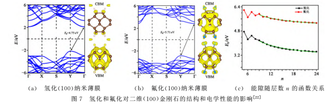 我們進一步研究了氫化和氟化對二維(100)金剛石的結構和電學性能的影響[22]。每個表面碳原子與一個氫(或氟)原子結合,形成了碳-氫或碳-氟共價鍵,構建了氫化(氟化)二維(100)金剛石納米膜。聲子色散曲線和分子動力學結果表明,最小層數(shù)n≥5,二維金剛石相動力學和熱力學穩(wěn)定。圖7(a)~(b)是層數(shù)n=6的氫化/氟化(100)金剛石納米膜的能帶結構,兩種結構表現(xiàn)出間接寬帶隙半導體特性。氫化(100)金剛石納米膜的能隙為4.75eV,價帶頂主要由碳原子貢獻,導帶底主要來源于碳-氫反鍵態(tài)和表面的非局域態(tài);氟化(100)金剛石納米膜的能帶結構和氫化構型類似,能隙為5.71eV,導帶底和價帶頂則由氟和碳原子共同貢獻。氫化和氟化二維(100)金剛石納米膜的能隙隨層數(shù)的變化關系如圖7(c)所示。能隙分別從4.76和6.18eV(n=5)逐漸減小到飽和值3.44和5.33eV(n=24),說明層數(shù)變化可有效地調制功能化金剛石納米膜的能帶結構。由于結構上下兩側的二聚體排列方向受到層數(shù)奇偶性的影響,當n<11時,能隙值會隨著層數(shù)奇偶性發(fā)生明顯波動。
