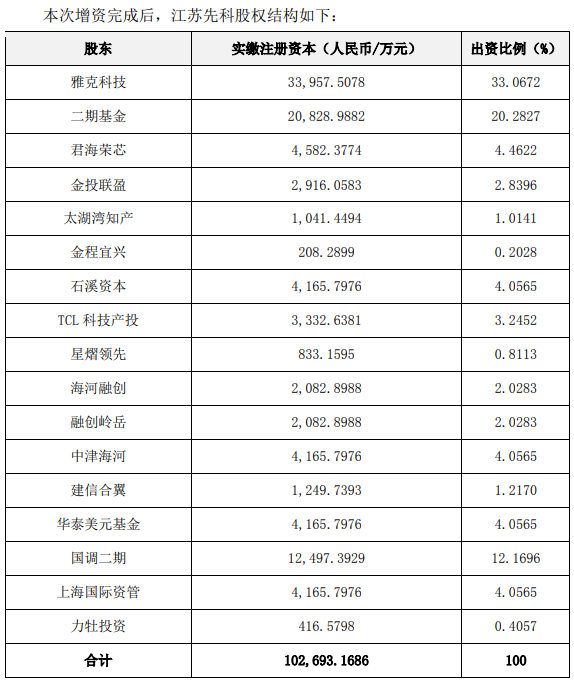 近日,雅克科技發(fā)布公告稱,公司擬放棄全資子公司江蘇先科半導體新材料有限公司優(yōu)先認繳出資權并引入戰(zhàn)略投資者。為發(fā)展需要,雅克科技擬與國家集成電路產(chǎn)業(yè)投資基金二期(簡稱大基金二期)、TCL科技產(chǎn)投等將合計向江蘇先科注資17.45億元。其中,大基金二期投入的5億元將用于江蘇先科在半導體領域前驅(qū)體等相關材料的研發(fā)及生產(chǎn)項目。