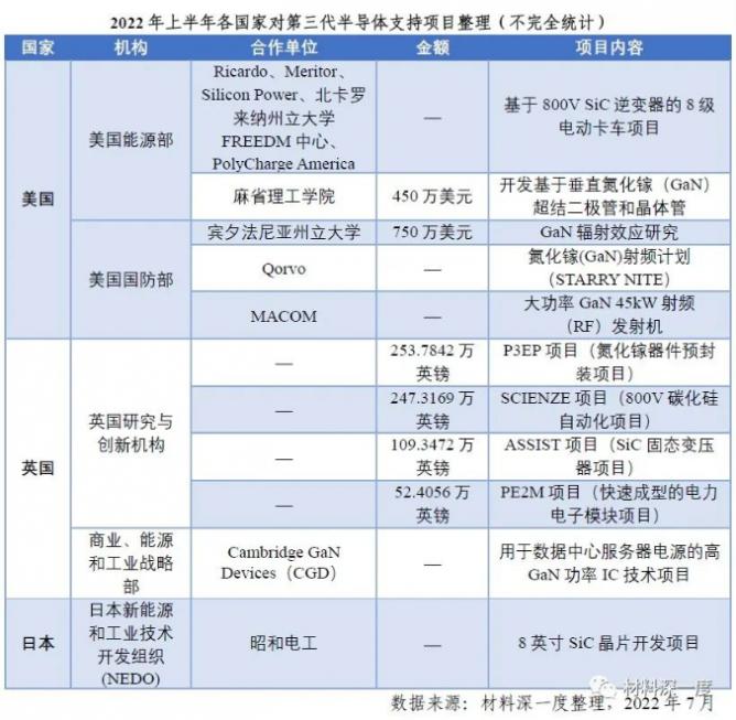 第三代半導(dǎo)體領(lǐng)域科技項目支持為主。據(jù)材料深一度不完全統(tǒng)計,截止2022年6月,美國、英國、日本政府先后資助了10個第三代半導(dǎo)體相關(guān)項目,涉及金額超過1億人民幣。其中,美國能源部與國防部資助了高校企業(yè)5個GaN與SiC項目,重點研究800V SiC逆變器與GaN射頻。英國研究與創(chuàng)新機(jī)構(gòu)為打造本土功率電子供應(yīng)鏈,應(yīng)對疫情帶來的國際貿(mào)易影響,共向4個SiC/GaN項目提供約5537萬元支持,同時商業(yè)、能源和工業(yè)戰(zhàn)略部支持Cambridge GaN Devices(CGD)公司開展用于數(shù)據(jù)中心服務(wù)器電源的高GaN功率IC技術(shù)項目;此外,日本新能源和工業(yè)技術(shù)開發(fā)組織(NEDO)資助了昭和電工的8英寸SiC晶片開發(fā)項目,應(yīng)對即將到來的8英寸SiC浪潮。