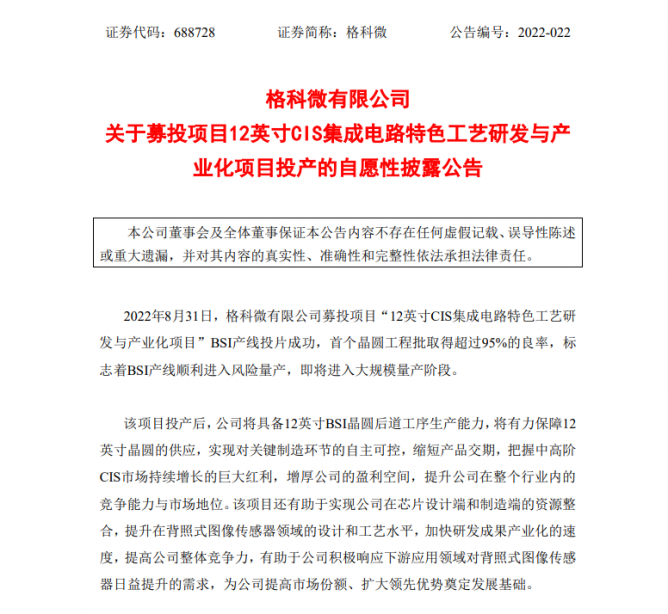格科微發(fā)布關于募投項目12英寸CIS集成電路特色工藝研發(fā)與產(chǎn)業(yè)化項目投產(chǎn)的自愿性披露公告,公告指出,8月31日,格科微有限公司募投項目“12英寸CIS集成電路特色工藝研發(fā)與產(chǎn)業(yè)化項目”BSI產(chǎn)線投片成功,首個晶圓工程批取得超過95%的良率,標志著BSI產(chǎn)線順利進入風險量產(chǎn),即將進入大規(guī)模量產(chǎn)階段。