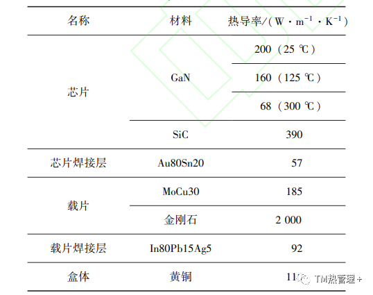 在圖 1 所示的封裝結(jié)構(gòu)中, GaN 功率芯片襯底為 SiC 材 料, 芯片尺寸為 5.0 mm × 6.65 mm ×0. 08 mm, 有源區(qū)面積為 4.28 mm2,芯片與載片通過 Au80Sn20 焊料連接;載片尺寸為 5. 0 mm ×10.6 mm×0.3 mm,載片與盒體通過 In80Pb15Ag5焊料連接。仿真模型中焊料層與實(shí)測(cè)器件保持一致,厚度為 0.05 mm,界面接觸系數(shù)按照 5%空洞率設(shè)置。計(jì)算模型采用六面體進(jìn)行網(wǎng)格劃分,網(wǎng)格總數(shù)約為 30 萬。模型中各部分材料參數(shù)如表 1 所示。