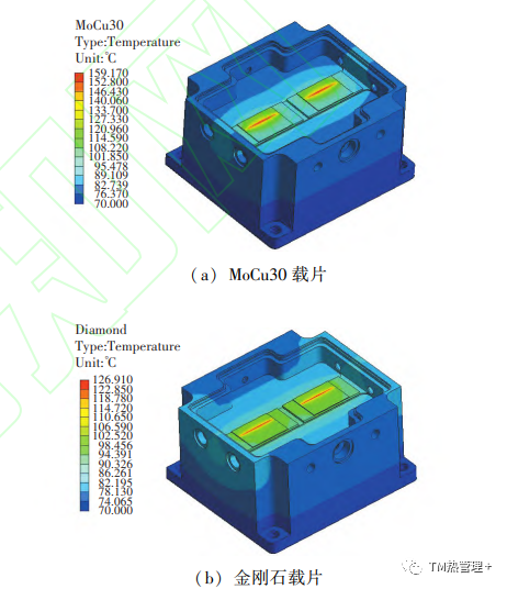 圖 4 采用不同載片的放大器的溫度場(chǎng)分布仿真結(jié)果