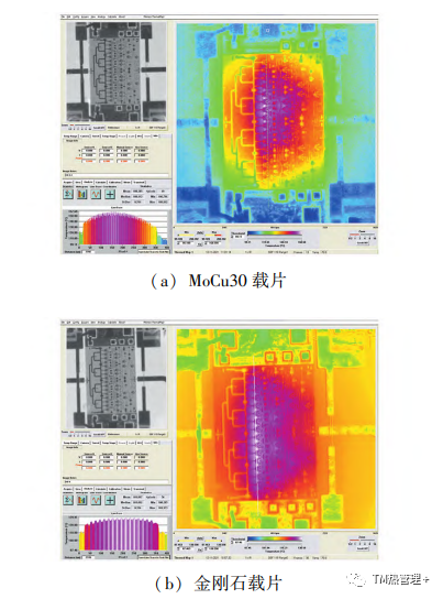 為提高測(cè)量精度,利用同一臺(tái)紅外熱成像儀對(duì)功率放大器結(jié)溫直接進(jìn)行測(cè)試,以減小測(cè)試誤差。測(cè)試過程使用與有限元仿真中相同的工作條件,圖5 為分別采用 MoCu30 載片和金剛石載片的兩種放大器的表面溫度分布熱成像。由圖可見, MoCu30和金剛石載片封裝器件的芯片結(jié)溫分別為160.60 ℃和 130.59 ℃ ,采用金剛石載片的芯片結(jié)溫較 MoCu30 載片的降低了30.01 ℃ ,約 18.69%,與仿真結(jié)果趨勢(shì)一致。
