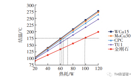 圖 6 采用不同載片材料的芯片結(jié)溫隨熱耗的變化曲線