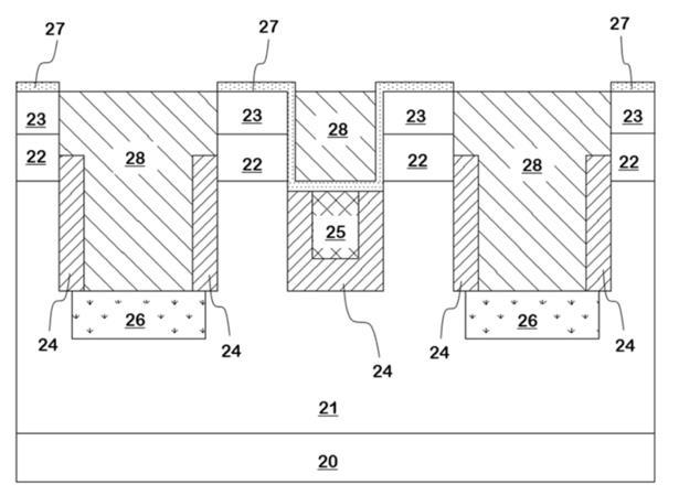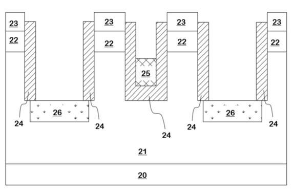 如上圖,為覆蓋有絕緣層以及進(jìn)行各向異性刻蝕的半導(dǎo)體結(jié)構(gòu)示意圖,第一絕緣層24為覆蓋柵極溝槽的內(nèi)壁并覆蓋源極溝槽的內(nèi)壁,其通過對氧化硅進(jìn)行淀積工藝形成。然后形成第一導(dǎo)電層并回刻,刻蝕后剩余的第一導(dǎo)電層在柵極溝槽內(nèi)形成第一柵極25。