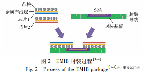 EMIB 封裝是在封裝基板中嵌入一小塊 Si 橋作為多片芯片的互連結(jié)構(gòu)。與臺積電的 CoWoS封裝類似,首先仍是制備好需要進行封裝的芯片,芯片背面磨薄,但正面有與封裝基板相連的凸塊,KGD 切割待用,無需封裝。同時,EMIB 封裝無需Si 中介層,而是直接在封裝基板中嵌入具有互連功能的 Si 橋。然后將 KGD 倒裝、對準,直接與嵌有 Si 橋的封裝基板通過凸塊相連。EMIB 封裝的具體過程如圖 2 所示。與臺積電的 CoWoS 封裝相比,EMIB 封裝既不需要 TSV 工藝,也不需要 Si 中介層,因此其具有封裝良率高、設(shè)計簡單、成本更低等優(yōu)點。