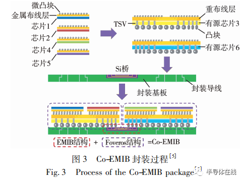Co-EMIB 則是英特爾綜合了 EMIB 和 Foveros兩種封裝技術(shù)而實現(xiàn)的創(chuàng)新封裝技術(shù),在 Foveros技術(shù)的水平物理層互連和垂直互連的同時,借由EMIB 封裝實現(xiàn) Foveros 3D 堆疊之間的水平互連,復(fù)雜的互連結(jié)構(gòu)對布線設(shè)計水平提出了極高的要求。Co-EMIB 的封裝過程是先利用 Foveros 的方法,將多塊芯片形成不同的組塊,再利用 EMIB 封裝的方法將這些組塊通過 Si 橋連接起來。不管是 2D 水平互連還是 3D 堆疊互連,單片與單片之間都可以實現(xiàn)近乎 SOC 級高度整合的低功耗、高帶寬、高性能表現(xiàn),為芯片封裝帶來絕佳的靈活性。Co-EMIB 封裝的具體過程如圖 3 所示。