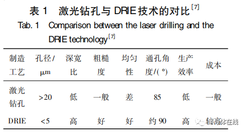 晶圓上的 TSV 形成是 TSV 技術(shù)的核心,目前的通孔加工技術(shù)主要分為兩種: 一種是激光鉆孔;另一 種 是 深 反 應(yīng) 離 子 刻 蝕 ( deep reactive ionetching,DRIE) 。表 1 列出了兩種不同通孔制作技術(shù)的對比。