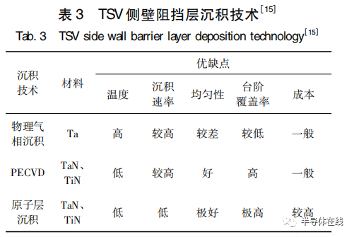 在填充金屬之前,必須先進行絕緣層的沉積,隔斷填充金屬與 Si 之間的電導(dǎo)通。通孔內(nèi)壁絕緣層材料包括硅氧化物、硅氮化物和聚合物等。不同絕緣層材料需要用不同的沉積技術(shù),如表 2 所示。等離子體增強化學(xué)氣相沉積 ( PECVD)技術(shù)的沉積速率高、工藝溫度低、均勻性好且臺階覆蓋率高,廣泛應(yīng)用于沉積 SiO2等絕緣層材料。真空氣相沉積聚對二甲苯的工藝溫度最低,在要求更低沉積溫度的 TSV 工藝中應(yīng)用也比較廣泛。
