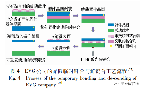 聚合物臨時鍵合采用的載片晶圓材料為玻璃。奧地利的公司提供了一種聚合物臨時鍵合的方案。在該方案中,采用紫外固化液態(tài)黏合劑將器件晶圓和玻璃載片進行臨時鍵合。如圖 4所示,經(jīng)過背面磨削后,利用光熱轉(zhuǎn)換 ( light to heat conversion,LTHC) 激光進行解鍵合,然后清洗表面,將黏合劑從晶圓上除去,完成整個工藝流程。
