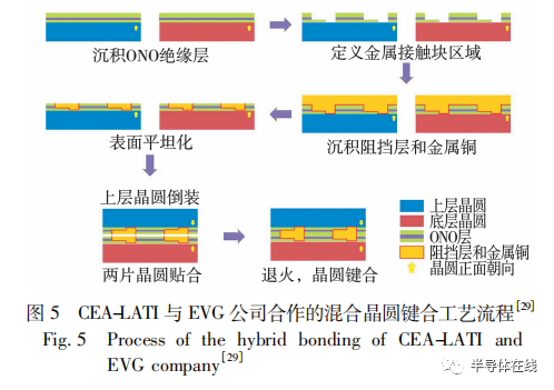 混合鍵合主要用于兩片器件晶圓的鍵合,而非器件晶圓與載片晶圓的鍵合。法國原子能委員會電子與信息技術(shù)實驗室 ( CEA-LATI) 與 EVG 公司合作,于 2017 年 率 先 實 現(xiàn) 12 英 寸 ( 1 英 寸 =2. 54 cm) 晶圓的混合鍵合,其混合鍵合中的金屬接觸 塊 的 材 料 是 Cu,金 屬 接 觸 塊 的 間 隔 約 為1 μm?;旌湘I合的工藝流程如圖 5所示。首先,在兩片晶圓上沉積硅氧化物-硅氮化物-硅氧化物 ( ONO) 絕緣層,然后用大馬士革工藝定義金屬接觸塊區(qū)域,沉積 TaN/Ta 阻擋層并沉積 Cu,再進行特殊的表面處理使表面粗糙度小于 0. 5 nm,最后,將一片晶圓倒裝與另一片晶圓貼合,在400 ℃下退火,使兩片晶圓形成鍵合?;旌湘I合不需要載片晶圓或黏合劑,同時不需要 TSV 即可使兩片器件晶圓鍵合,具有成本低廉、工藝簡單等優(yōu)點。