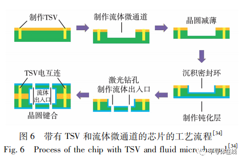 外部散熱措施會增加系統(tǒng)的復(fù)雜性,但是可以極大地提高系統(tǒng)的散熱能力。目前工業(yè)上采取的方法是在芯片或晶圓上增加熱管理微通道,可以使流體在微通道中流通,提高散熱效率。并在流體通道周圍設(shè)置密封環(huán),將流體與電互連隔絕開來。具體的工藝流程如圖 6所示。在刻蝕 TSV 通孔后,會刻蝕出比 TSV 淺的流體微通道,晶圓減薄后,TSV 中的金屬會露出,但流體微通道仍保持密閉。